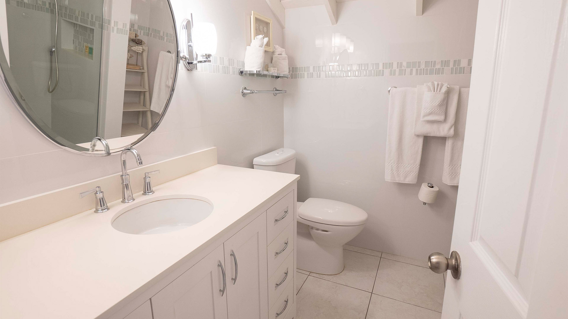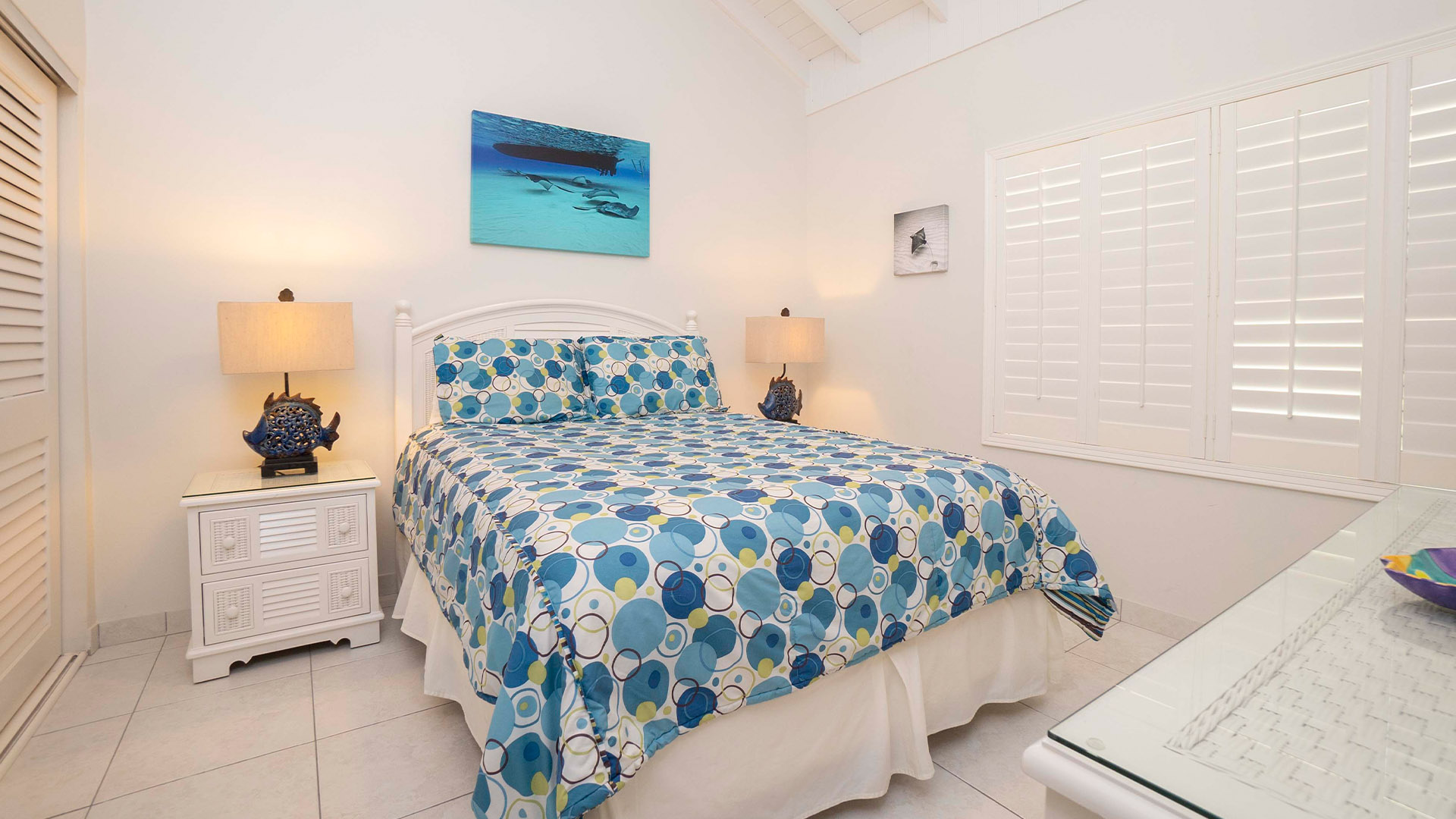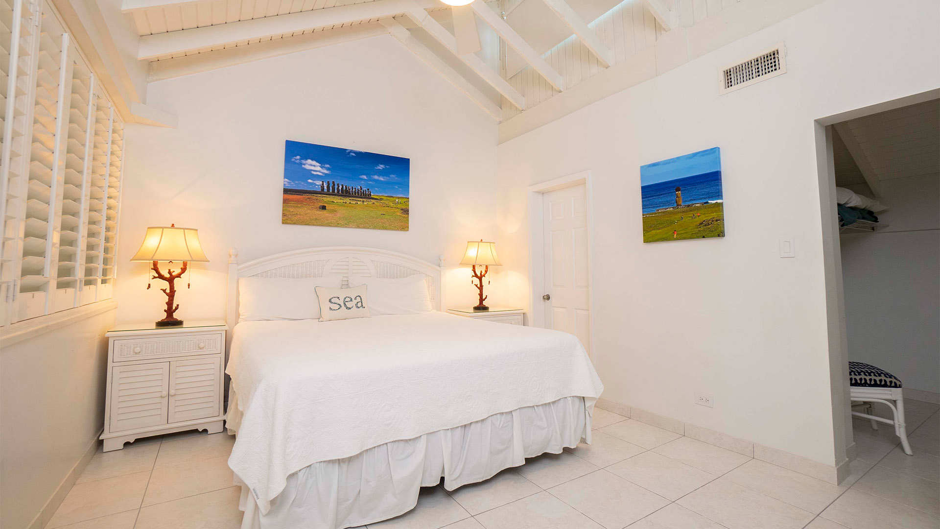 The primary bedroom, positioned in the upstairs vault-ceiling loft, features light-dimming shutters and a privacy door. It offers a comfortable rattan king bed and an adjoining 3-piece bathroom. On the lower level, the second bedroom is furnished with a queen bed, providing additional options for guests.