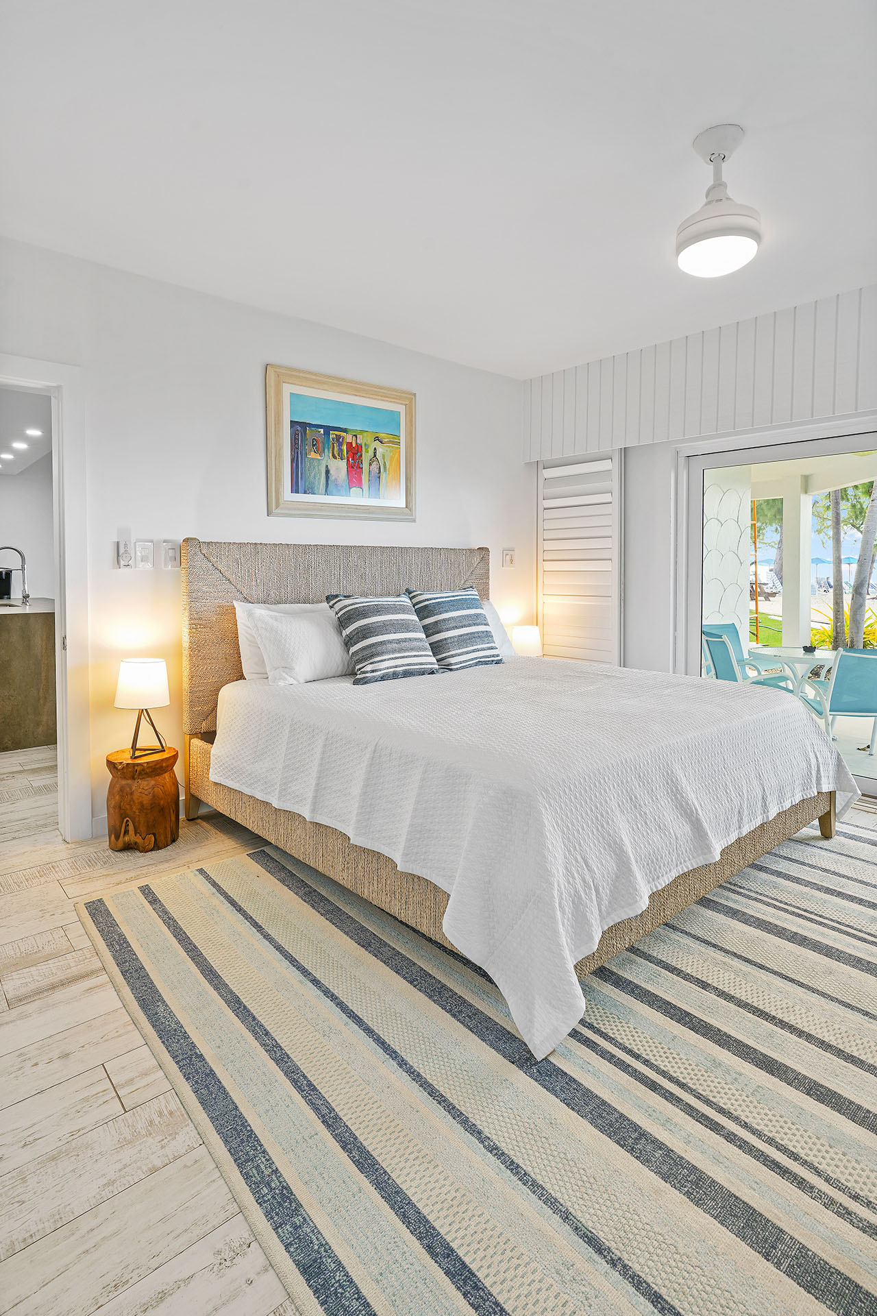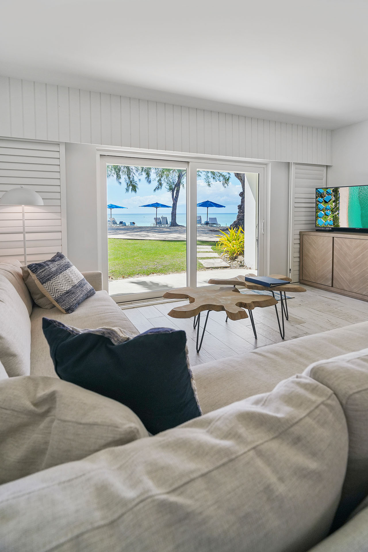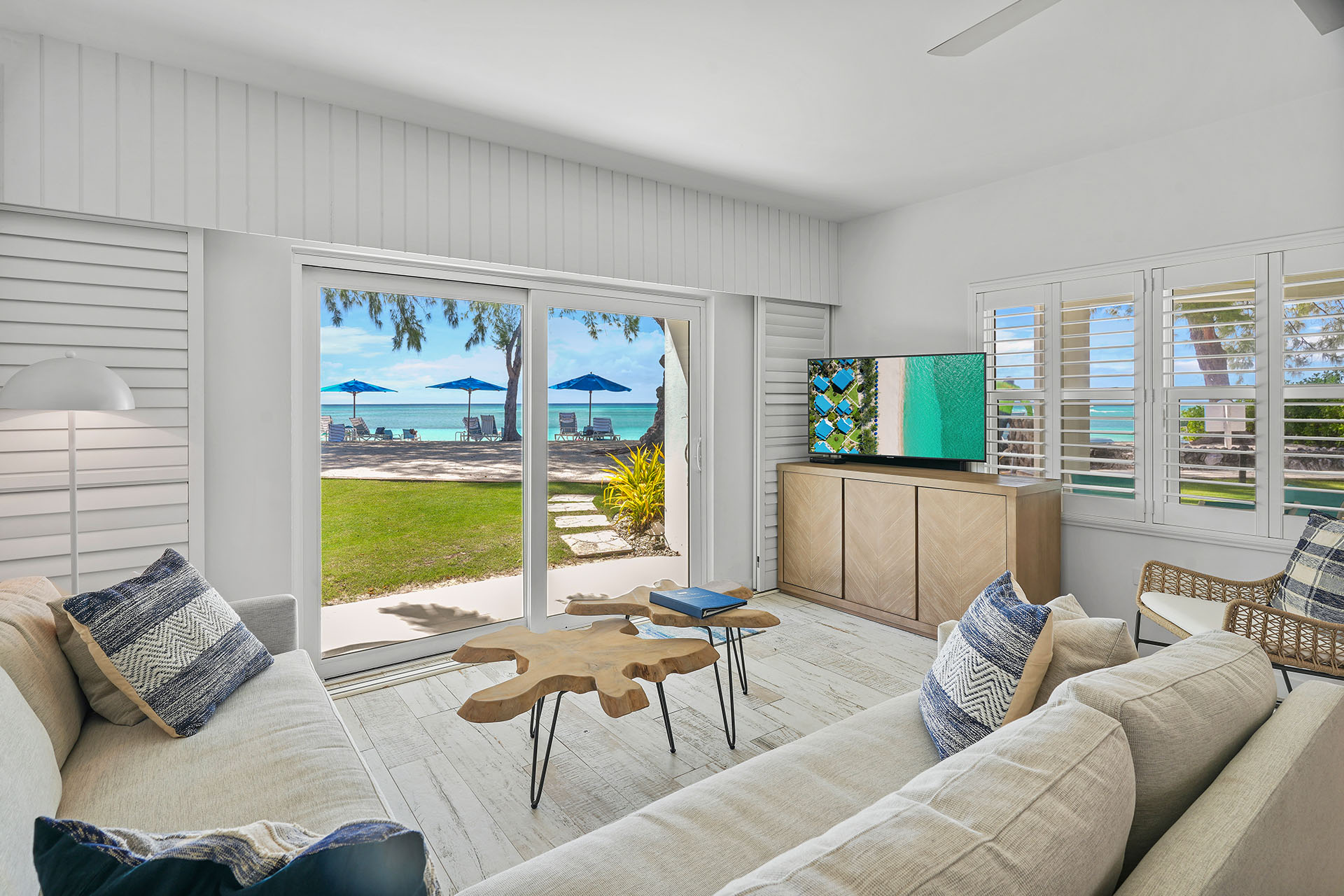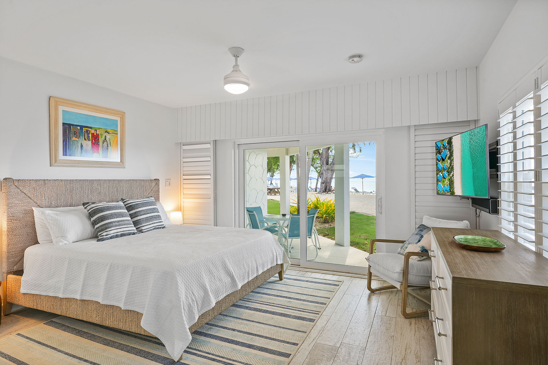 Premium Villa: This spacious, newly renovated 1,332 sq. ft. ground-floor 2-bedroom, 2-bathroom villa sits directly on Seven Mile Beach, offering easy access to the stunning sand and sea. The primary bedroom features a king-sized bed, ample closet space, patio access, and an ensuite 3-piece bathroom, complete with a large single-sink vanity and a beautifully tiled walk-in shower. The second bedroom offers 2 queen-sized beds, providing plenty of space for family and friends, and is conveniently located near the second 3-piece bathroom, which also includes a walk-in shower.