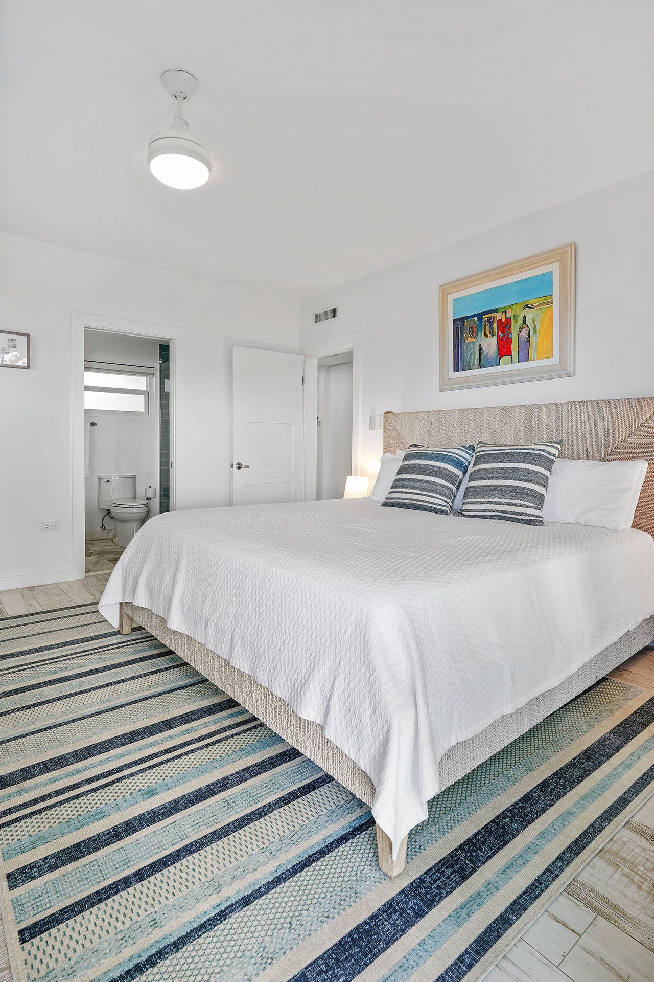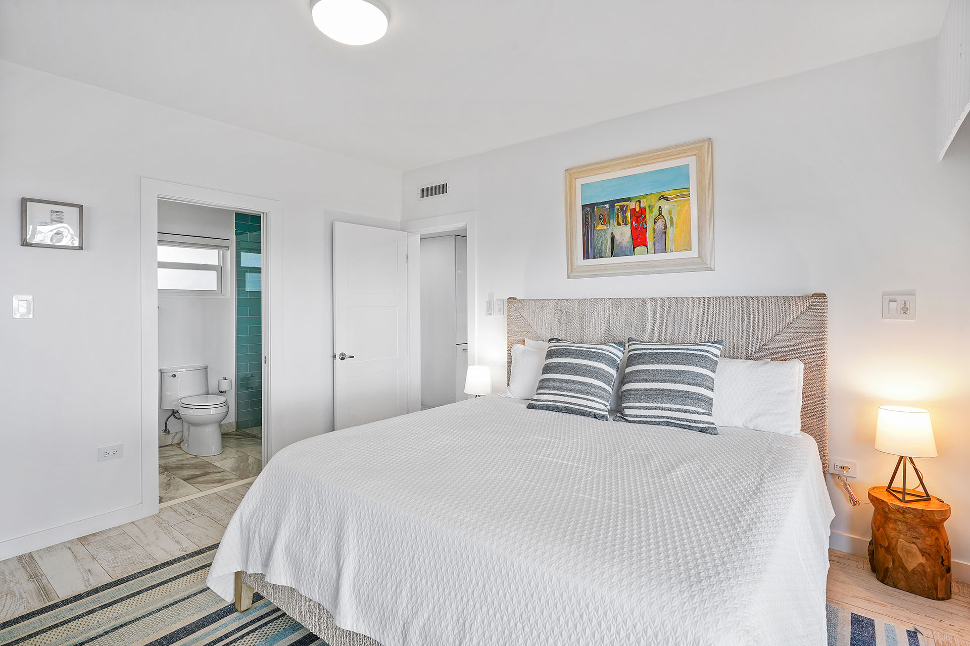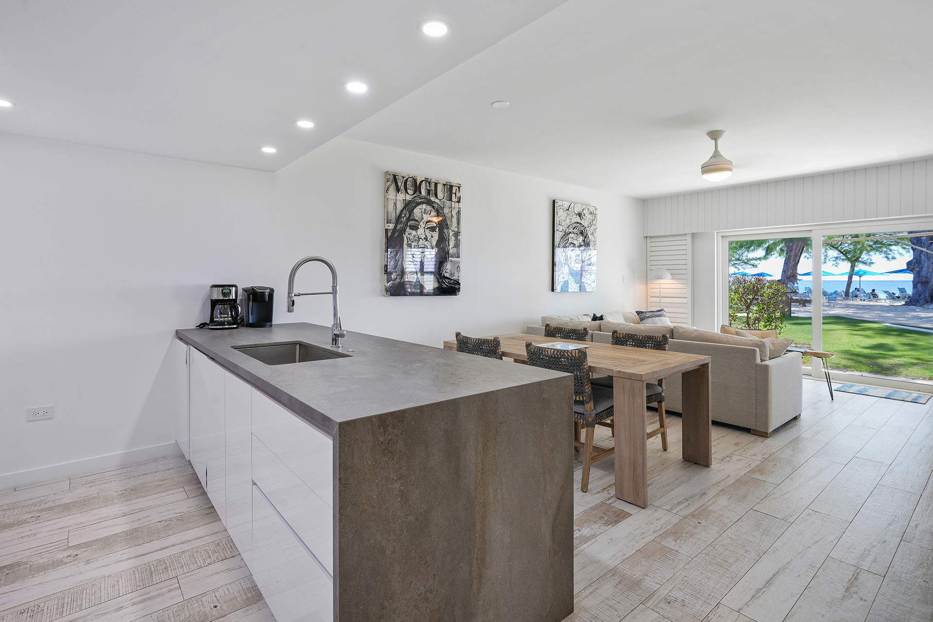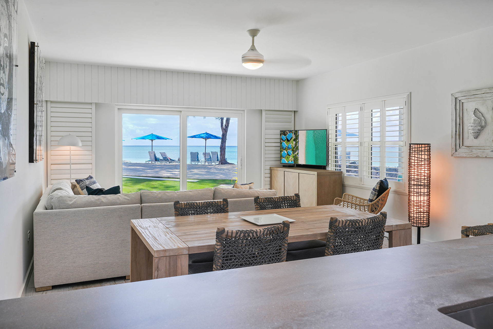 Premium Villa: This spacious, newly renovated 1,332 sq. ft. ground-floor 2-bedroom, 2-bathroom villa sits directly on Seven Mile Beach, offering easy access to the stunning sand and sea. The primary bedroom features a king-sized bed, ample closet space, patio access, and an ensuite 3-piece bathroom, complete with a large single-sink vanity and a beautifully tiled walk-in shower. The second bedroom offers 2 queen-sized beds, providing plenty of space for family and friends, and is conveniently located near the second 3-piece bathroom, which also includes a walk-in shower.