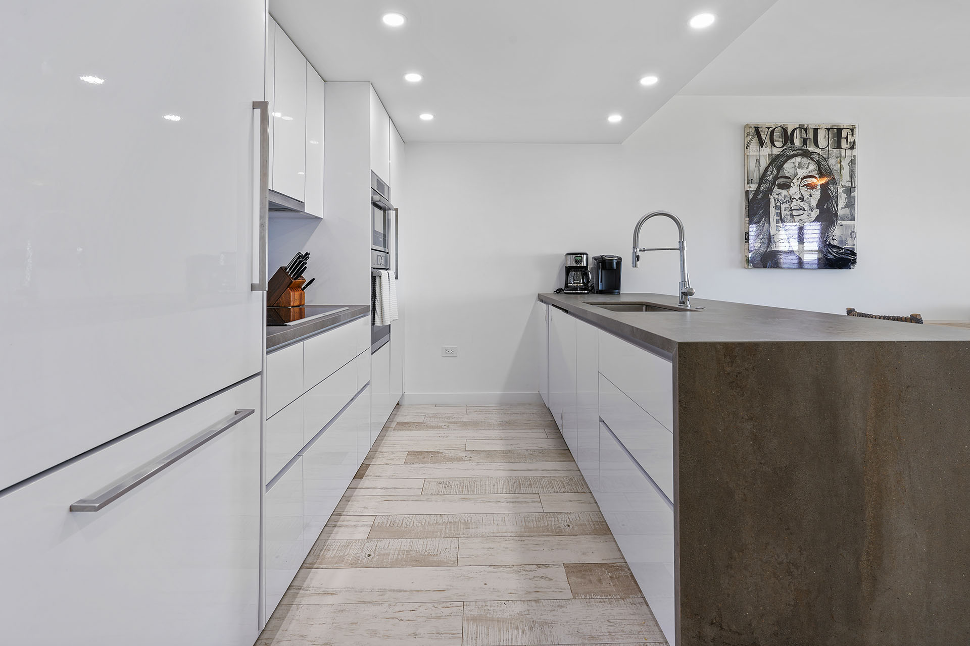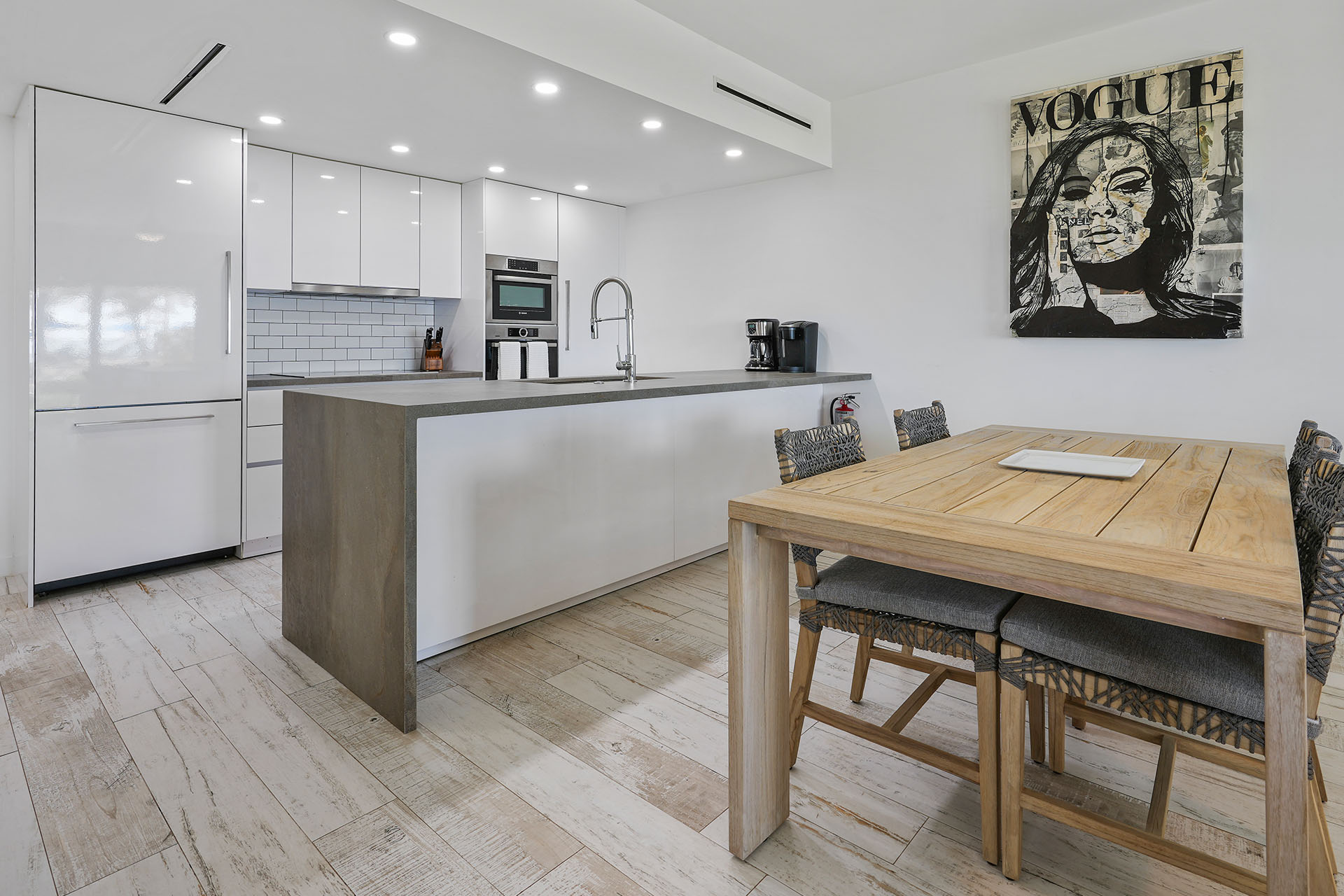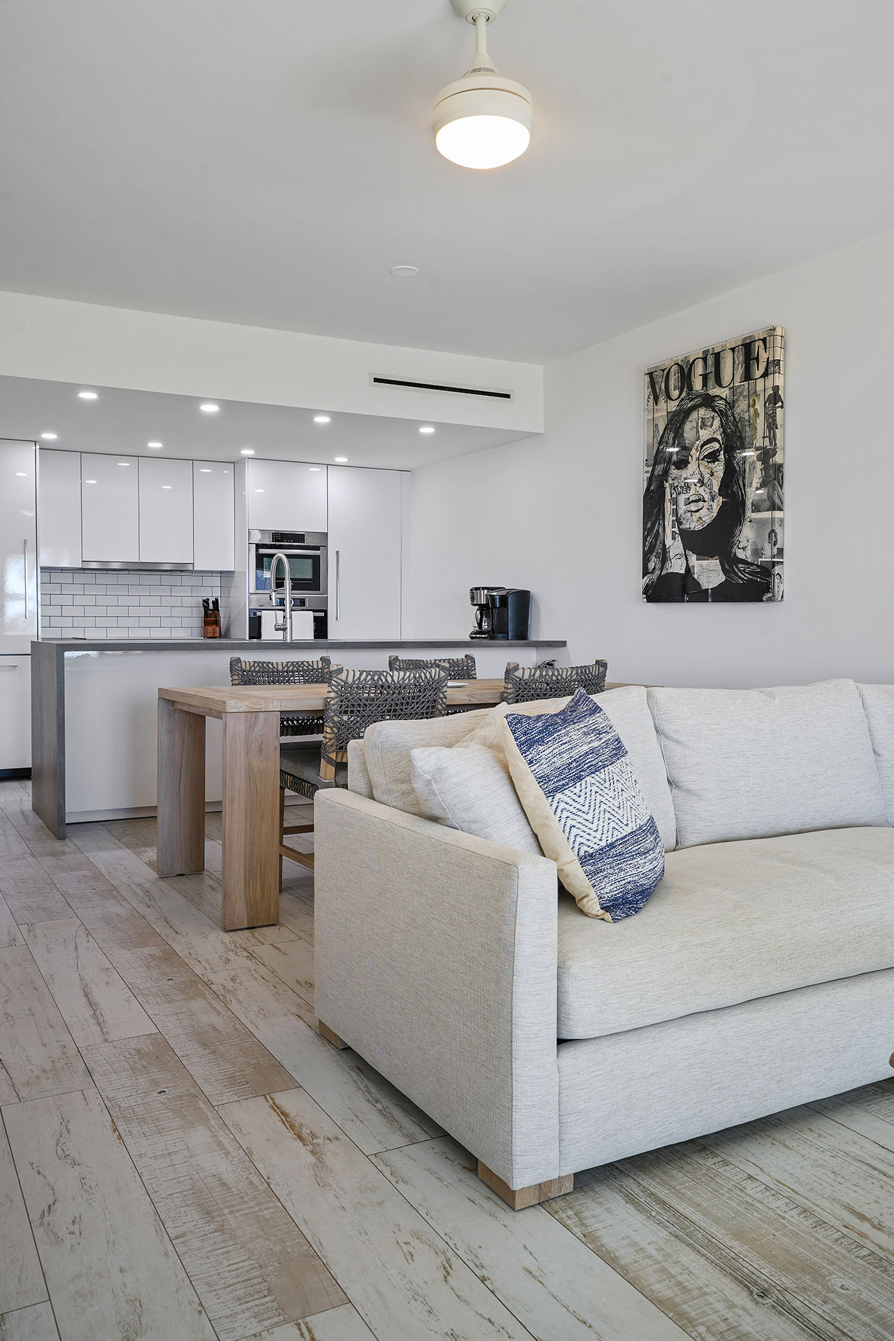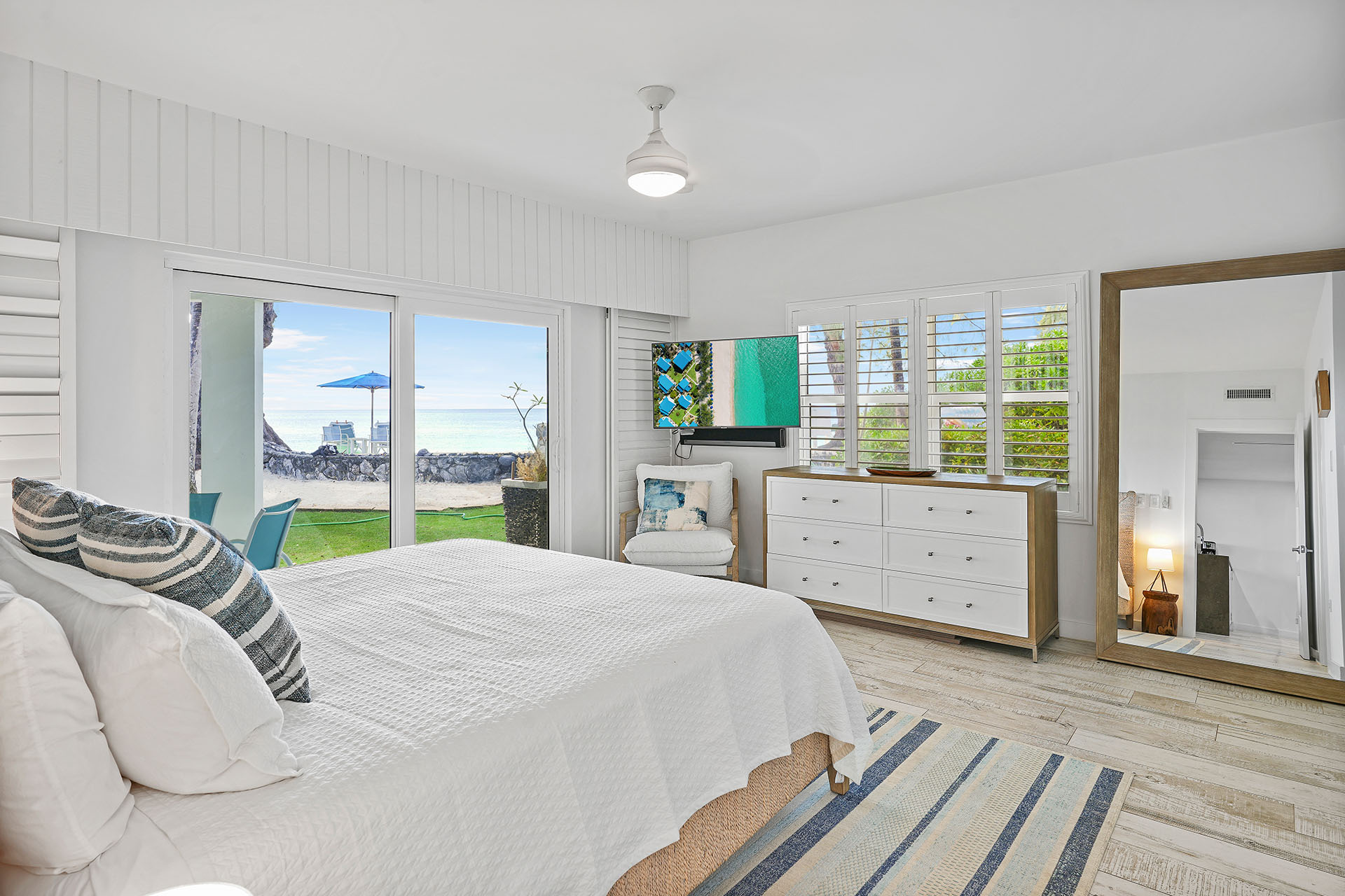 Redesigned for both cooking and entertaining, the gourmet kitchen boasts high-end stainless steel appliances, a quartz island, and generous counter space. The updated furnishings and beach-inspired décor create a relaxed coastal ambiance, flowing seamlessly into the open living area and out onto double patios with peaceful beach views.
